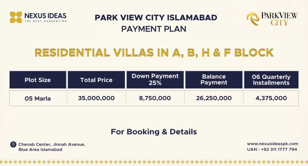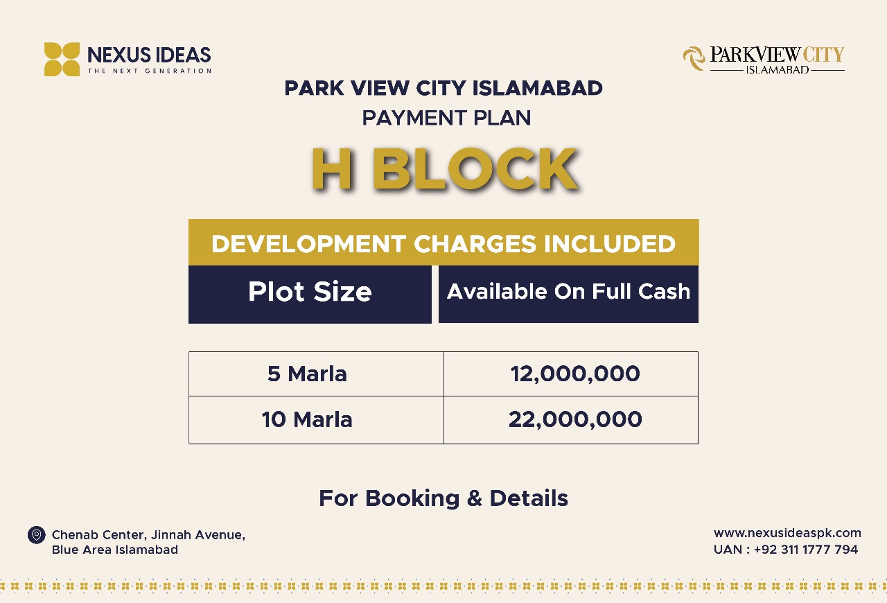 The Overseas Block has a three-year park view city payment plan. 10 Marla plots for sale in park view city Islamabad may be reserved for just ten percent. In contrast, the block would have a unique entrance and focused medical and educational services with a 25% discount.